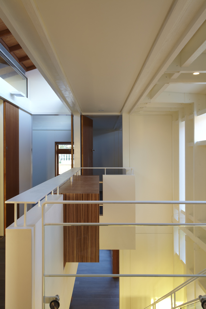 On the first floor there are four bedrooms and two bathrooms, connected by an open walkway around the central atrium and staircase. Joinery elements are integrated within the balustrade wall of the walkway to provide storage on the first-floor level and act as a sculptural element when viewed from the ground-floor entry area.