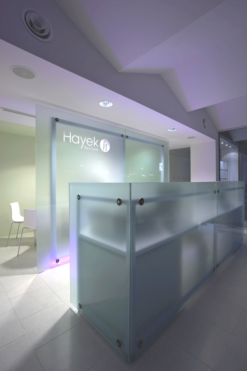 The reception area was created by enclosing an existing outdoor space. The space was articulated through the use of concrete columns and highlighted by the existing feature zig-zag shaped awning, facing the street. This newly created area was designed to be a feature with both the reception and meeting room partition wall behind being constructed of sand-blasted glass. This was set between white powder-coated steel frames giving the impression of a precious jewel-like element within the space being the first thing that is seen.