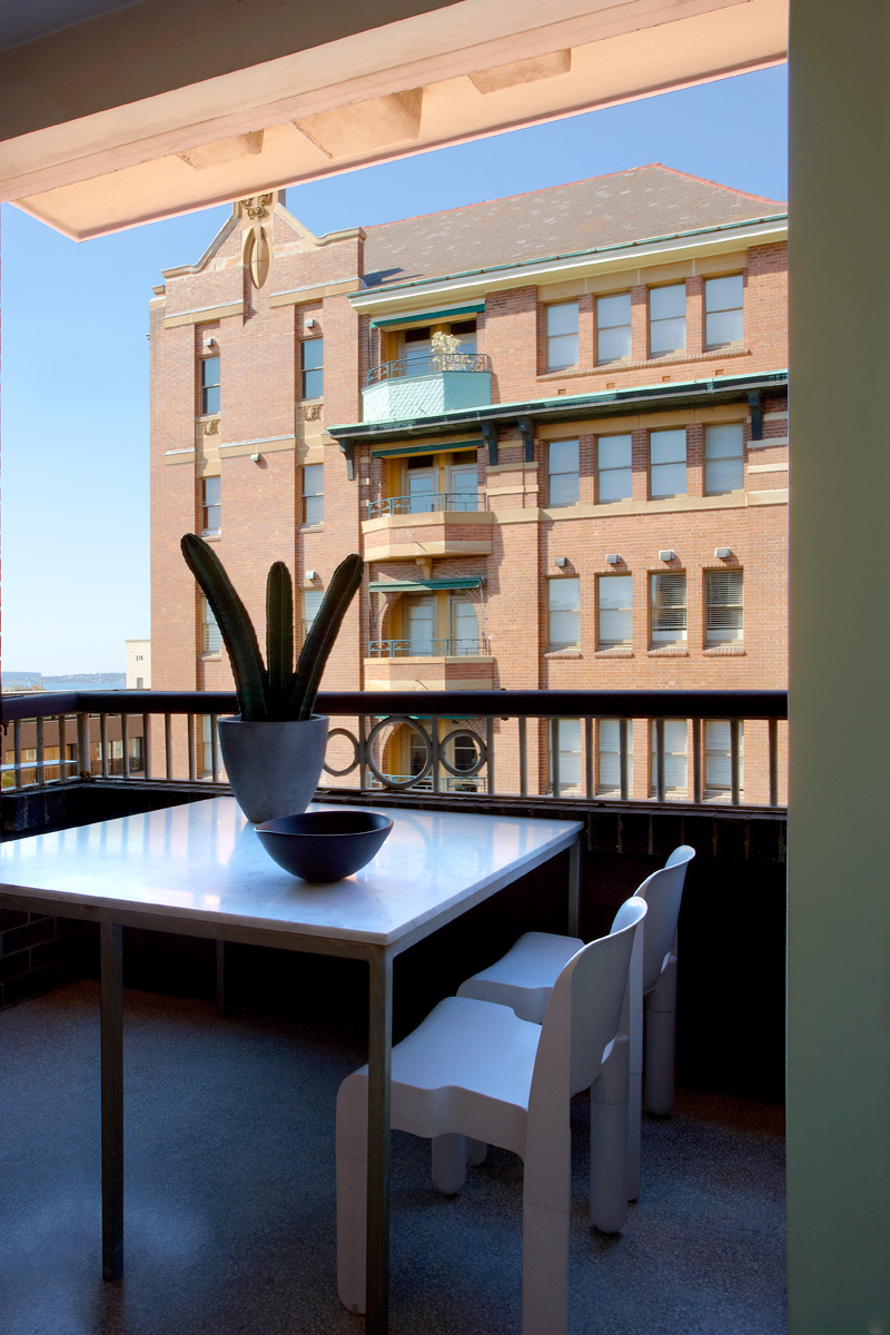 The apartment is situated in a 1920s Neo-Classical brick building on the bustling Potts Point peninsula.